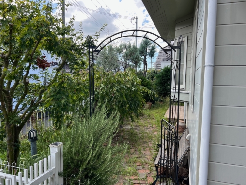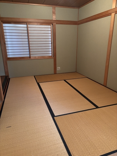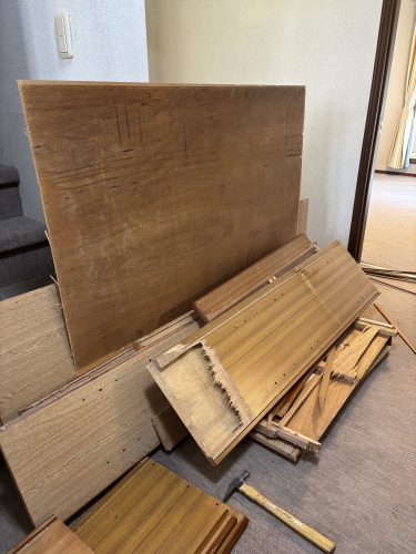 室内では残置物の撤去作業が行われていました。2階にあった大きな家具は、バラしてからお庭に運び出します。木製のもの、鉄製のものなどを分別。2階から1階を何往復したのか...部屋がスッキリしました。