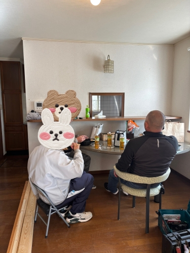 残置物のテーブルセット...椅子が足りなかったので、ひとり小さな椅子になってしまいましたが、みんなで楽しいお昼時間でした。